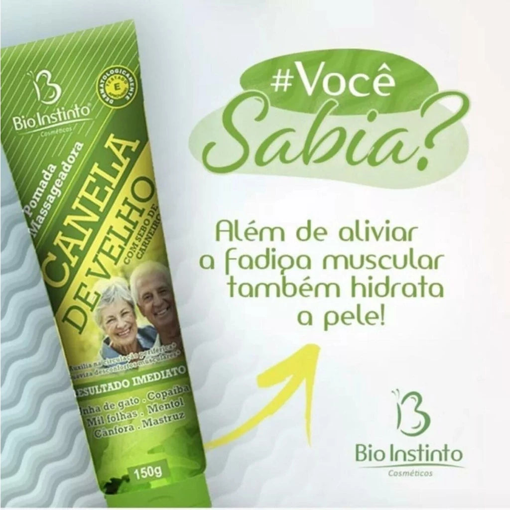 A Pomada Massageadora Canela de Velho Bio Instinto foi desenvolvida com uma fórmula cosmética de rápida absorção, composta por extratos naturais cuidadosamente selecionados. Ideal para quem busca bem-estar corporal e uma rotina de cuidados que proporcione sensação de relaxamento e conforto nas regiões tensionadas.